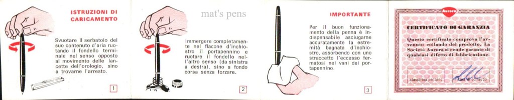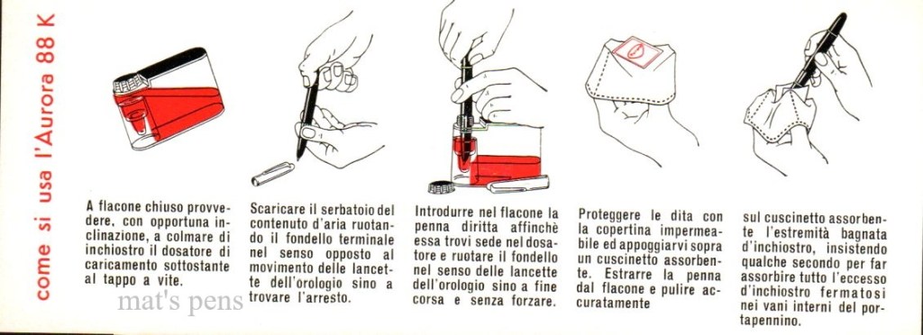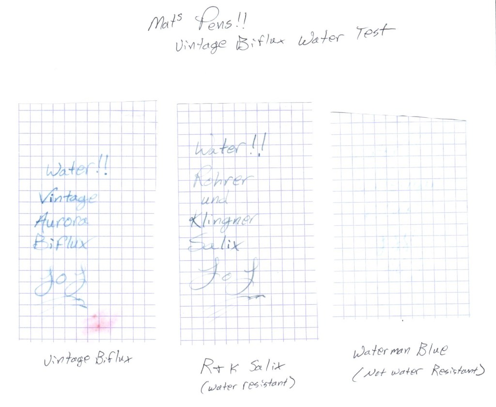 No sure where the red smudge came from, but it’s there. The vintage Biflux holds up to water just fine.Pure dyes, no harmful solvents, etc. I don’t speak Italian. The cap style of the illustrated pen on the left, though, is typical of an Aurora 88P, which was produced from approximately 1958 until approximately 1963. This ink is around 60 years old.