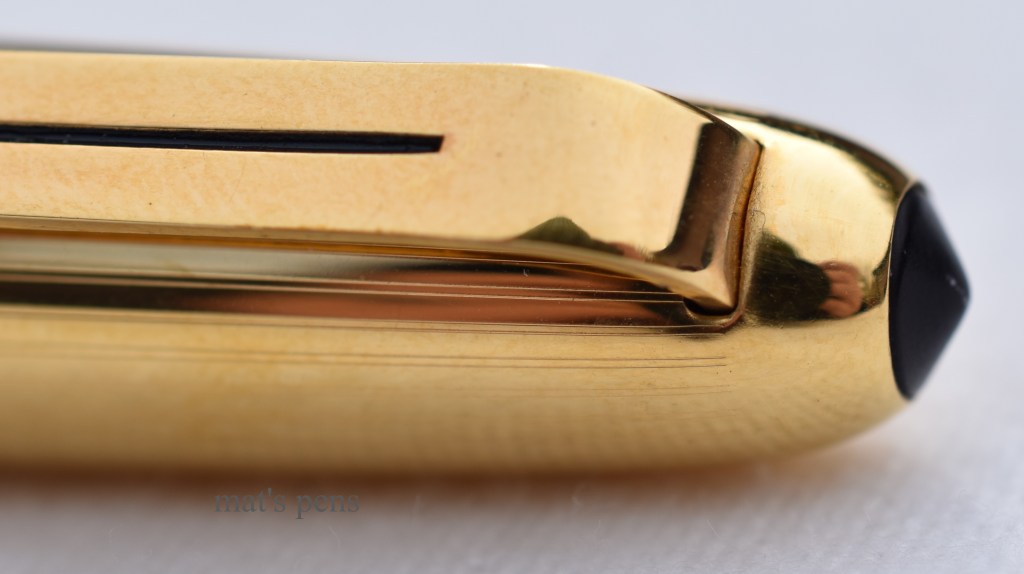 I like the shape of the clip. It is functional and secure.The cap features a simple band with the brand engraved in it.Reverse of the cap band.The finial is the same material as the rest of the pen.