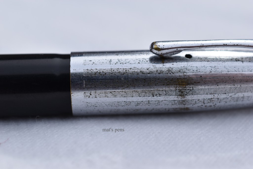 Detail of cap and clip. Each pen is serialized, also shown on the clip. Not shown is the exceptionally weak inner cap that does not keep this pen closed.
