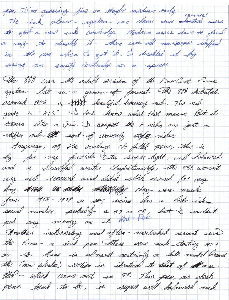 The dry time is long, around 30 seconds. Perhaps this is a side effect of its wetness. It’s somewhat hard to judge these qualities because the ink may have changed a bit in the last 60+ years it’s been hanging out.