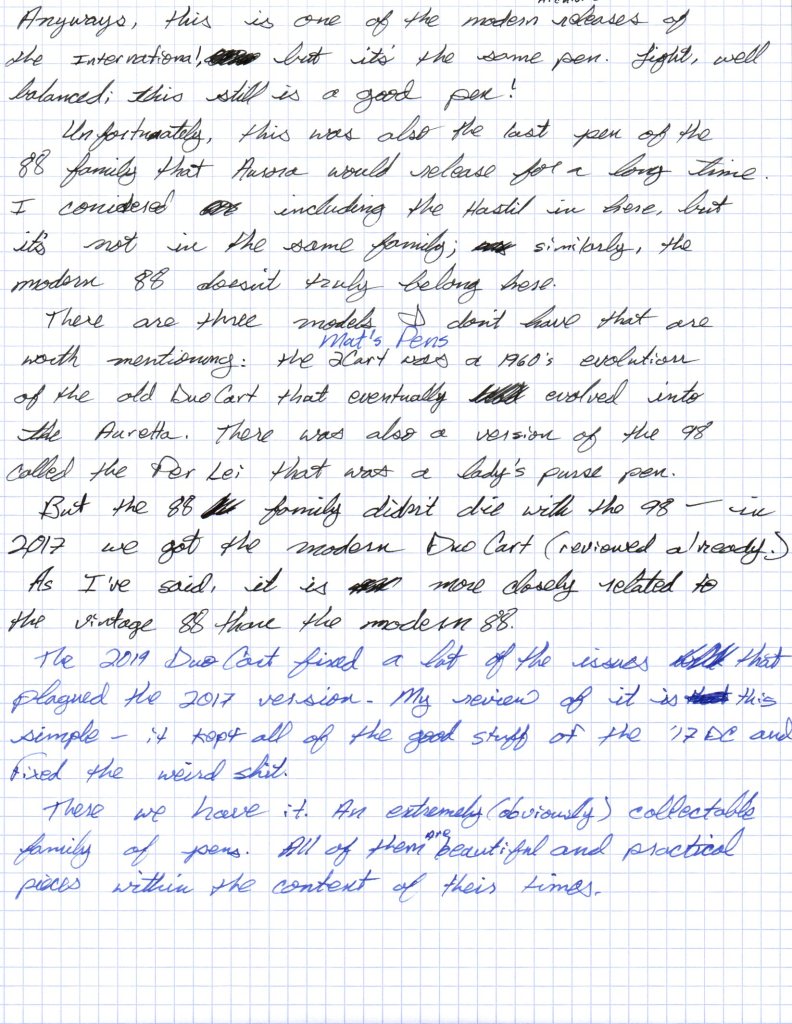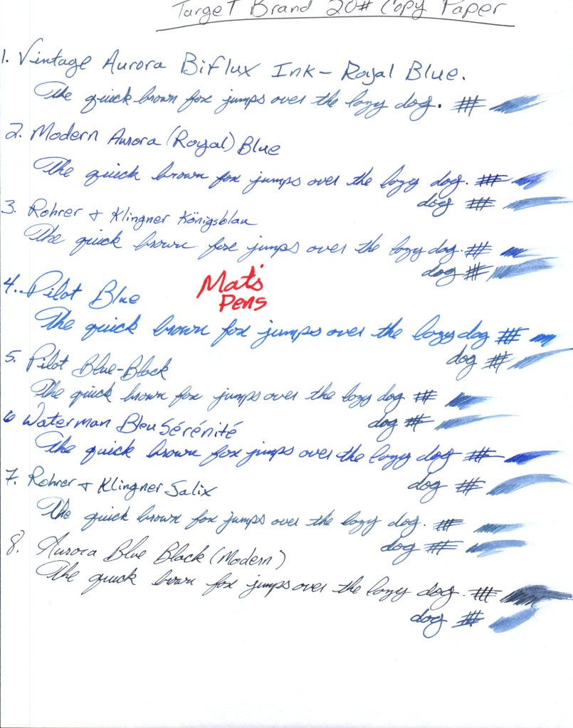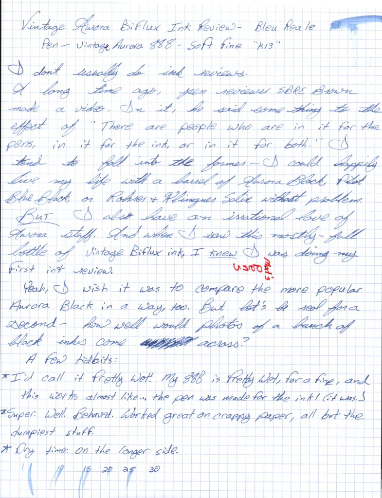 So there we have it. If I were forced to only use vintage Aurora Biflux Bleu Reale, I think I would get by. I’m not going to make it a habit of using this ink, I’m afraid–it’s too cool having it in my collection–but it was a very solid ink in its time and just as reliable today, if a bit on the utilitarian side. Anyone looking for a similar ink could check out Pilot Blue Black–it’s way, way cheaper, easier to find, and overall very similar in appearance and performance.