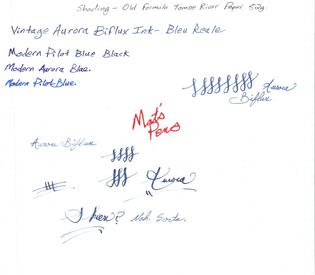 Shading is pretty standard. There isn’t much sheen to be had. I even sacrificed one of my last remaining sheets of the original formula, pre-shutdown Tomoe River paper and brought-out a super-secret Aurora friend that I can’t reveal yet–a combo that would certainly expose any neat sheening–and the results weren’t anything more interesting than a standard ink like Pilot Blue Black. There’s some there, but it’s not an ink those sheen-loving folks are going to go bananas over.