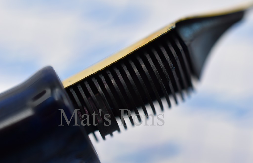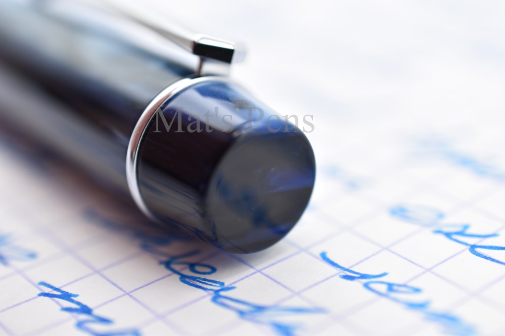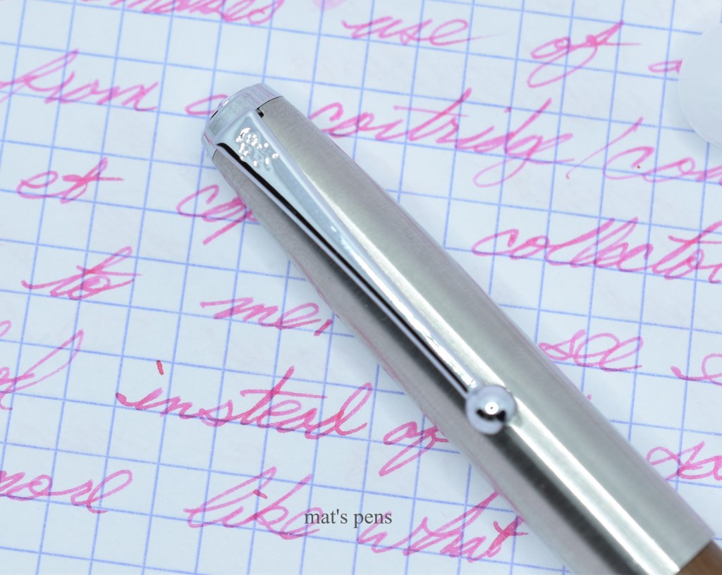 The pen features a very attractive two-toned nib, and it writes fairly well. It’s not my favorite nib ever, but it is adequate for the price of this pen. It is folded steel–the writing point is made by folding the nib onto itself and polishing that rather than attaching a separate pellet of tipping material and shaping that into a point. This is an old technique for making cheaper nibs, but the nibs’ profiles end up being squarish with smaller “sweet spots” than conventional nibs. Technicalities aside, the pen wrote just fine out of the box with no drama.