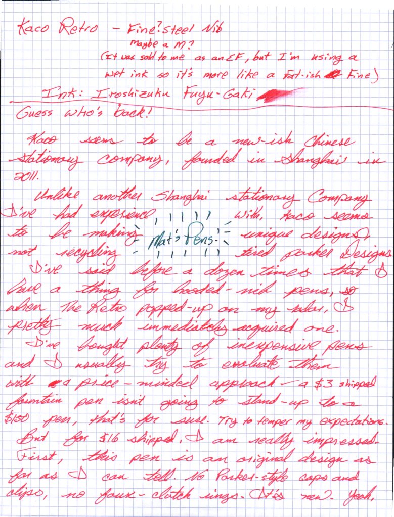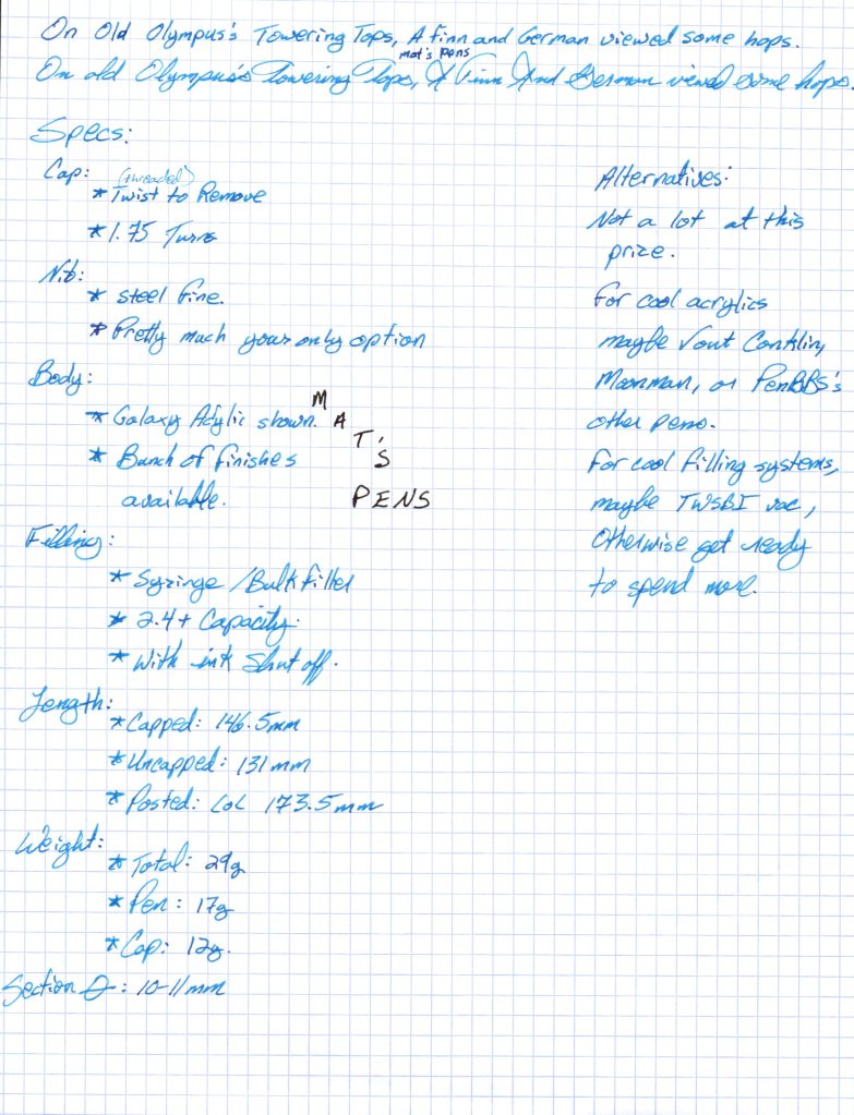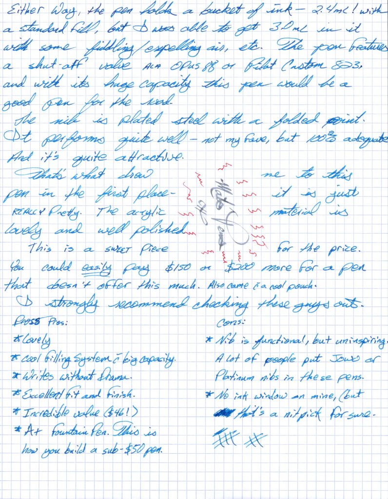 For the price, this is a sweet deal. It’s a pen by fountain pen people, for fountain pen people. The fit and finish are fantastic, the pen is attractive and feels good in the hand, and it writes correctly, even if the nib isn’t really inspiring. Other companies would happily charge $150 or $200 more for the same thing. I strongly recommend checking out this pen.